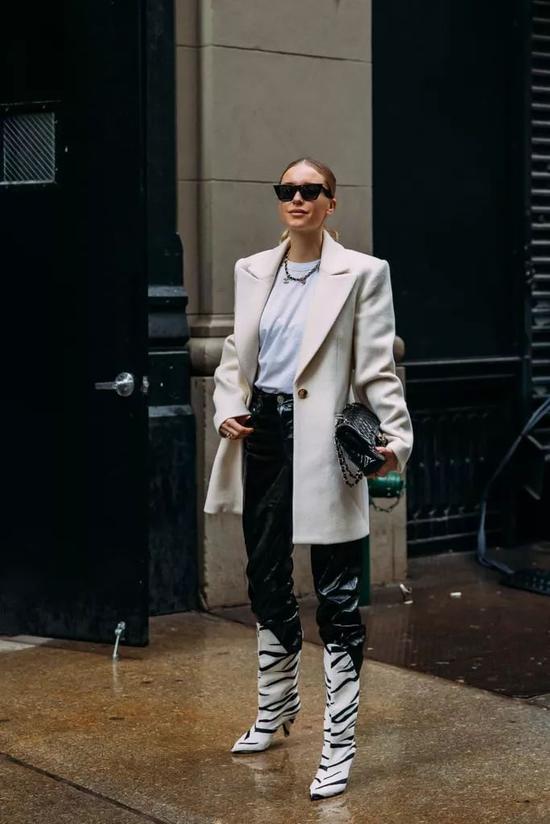 配大衣和高跟鞋,是很常规的穿法啦,但估计不少人会嫌脚冷,没事,换双尖头踝靴照样成立。