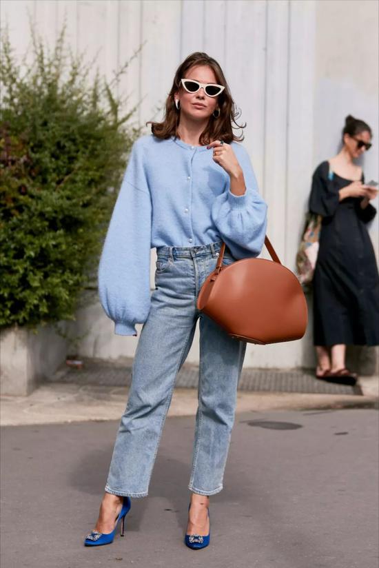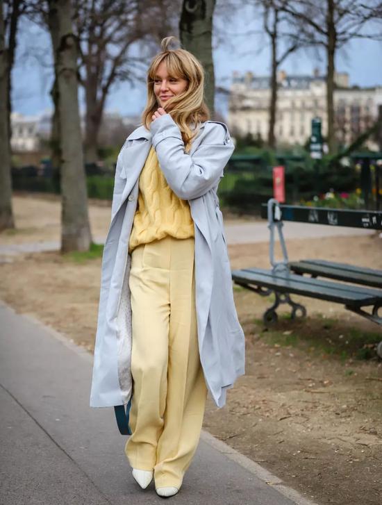 Romee穿的这种婴儿蓝色针织高领衫也是不错的选择,除了单穿,也十分时候作为内搭,因为大衣普遍都是深色系嘛,这样刚好平衡。