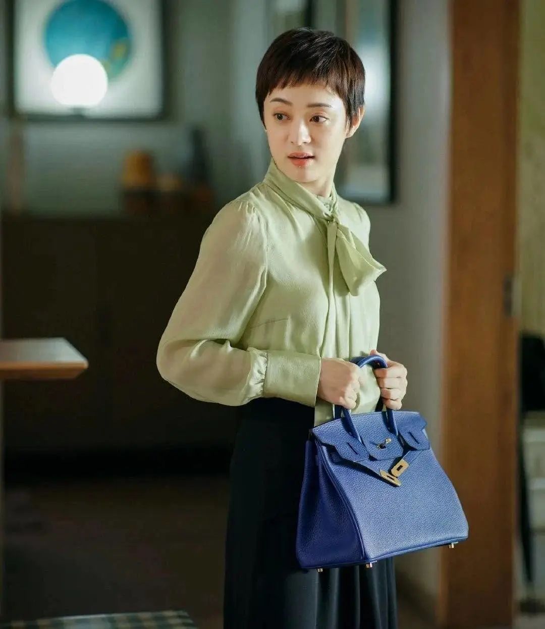 是不是和宝蓝色Birkin特别相配,仔细看看还是蓝绿撞色,这一身搭配突显了房店长的好衣品。